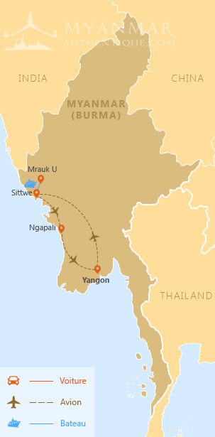 Voila une occasion d'explorer en profondeur la partie Ouest de la Birmanie. Nos visiteurs pourront découvrir les attraits de Sittwe avant d'embarquer sur un bateau vers Mrauk U pour découvrir de nombreux temples bien cachés, de splendides pagodes, des marchés animés et de splendides paysages. Une promenade en bateau dans les villages des minorités Lay Too Chin sera l'occasion d'aller  à la rencontre des femmes au visage tatoué La visite se terminera ensuite avec 3 jours sur les superbes plages de Ngapali. Encore préservés de la foule, venez vous détendre sur les plus belles plages de l'Asie du Sud Est.